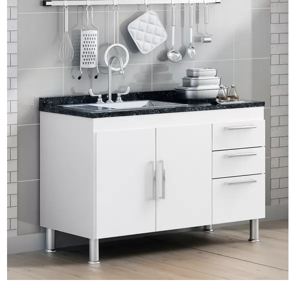 GABINETE PARA PIA | Este gabinete é produzido especialmente para pias de 1,20m, possui 3 gavetas com corrediças metálicas para melhor armazenar os itens de cozinha e conta com uma prateleira profunda completa no seu interior. Possui puxadores modernos e 4 pés para evitar empenamento da base, o gabinete é totalmente fabricado em MDP de 12mm, aumentando a durabilidade, resistência e qualidade do produto. O gabinete NÃO ACOMPANHA o tampo da imagem. Além desses detalhes possui uma fácil montagem. Altura total 0,83m x Largura 1,145m x Profundidade 0,52m