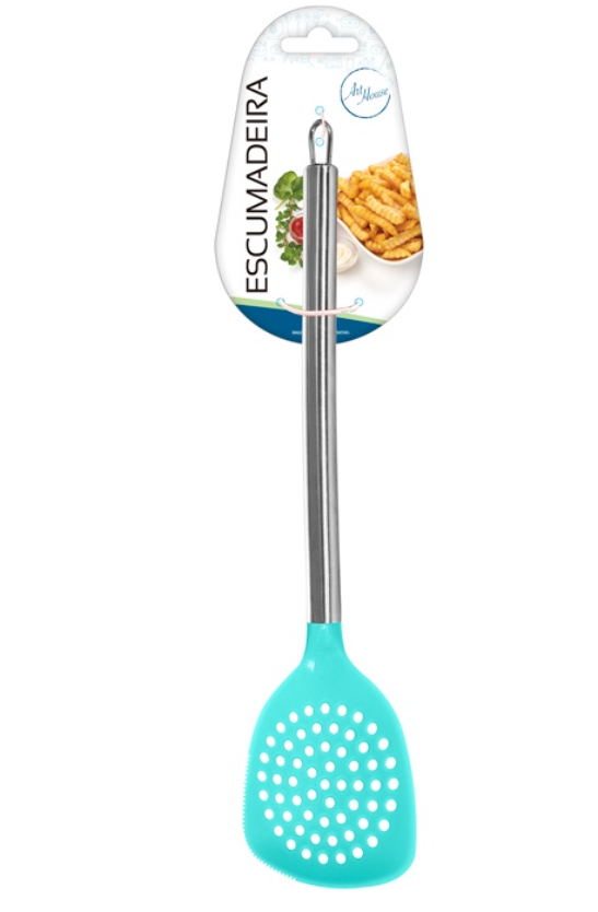 ESCUMADEIRA DE NYLON PRETA CABO INOX 34,5X11CM DE Ø Com a escumadeira de nylon Top House você terá mais praticidade nas preparações dos alimentos, além de ser muito fácil de usar e limpar, não ocupa muito espaço. O utensílio perfeito para sua cozinha