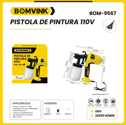 Compatível com diferentes tipos de tintas, a BOM-9568 se adapta facilmente às suas necessidades, seja para projetos de bricolagem ou trabalhos profissionais. A potência de 220V-110V garante um desempenho robusto, ideal para diversas superfícies e acabamentos.