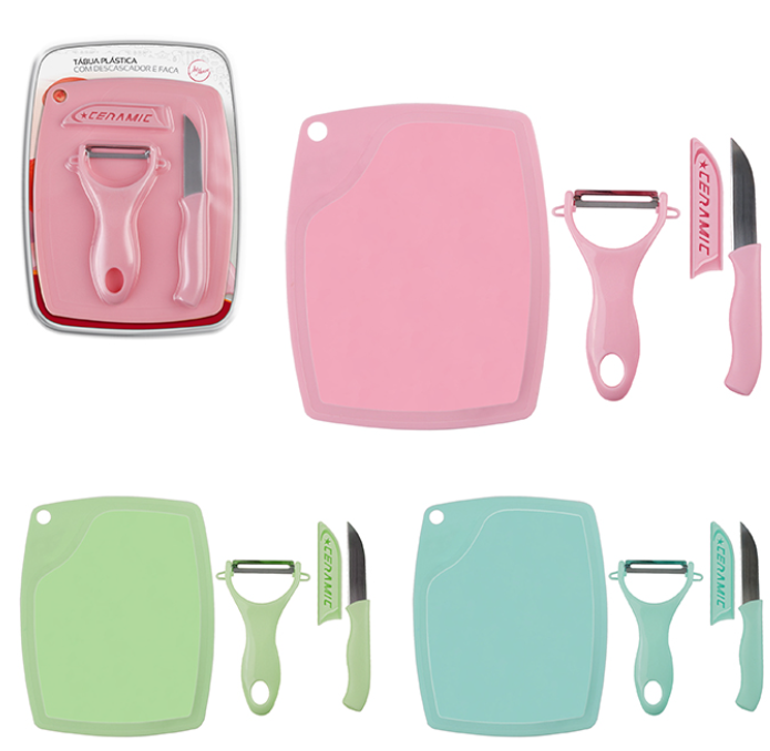 Contém: 1 Tábua, 1 Faca e 1 Descascador de legumes.